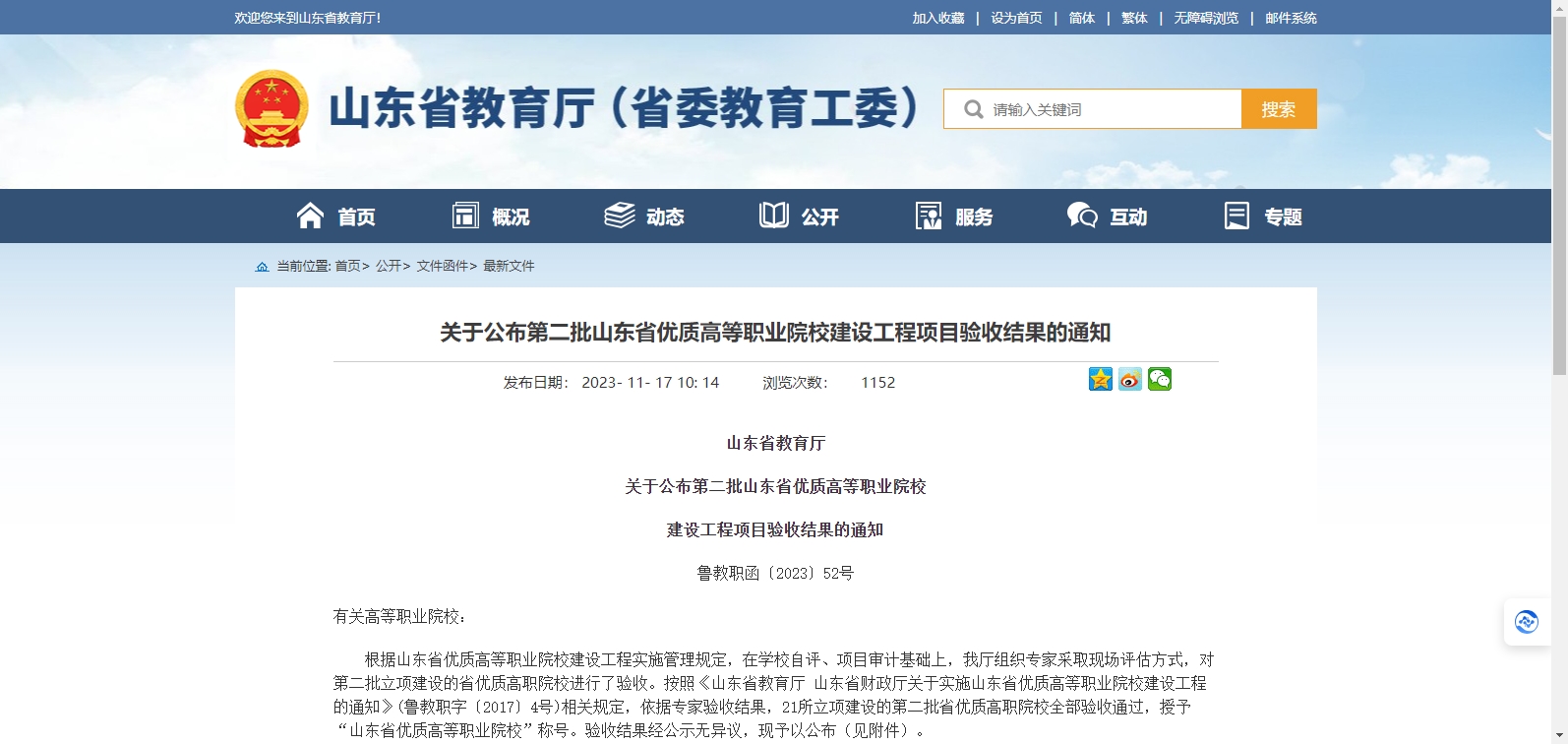 近日,山東省教育廳發(fā)布《關(guān)于公布第二批山東省優(yōu)質(zhì)高等職業(yè)院校建設(shè)工程項目驗收結(jié)果的通知》,按照《山東省教育廳 山東省財政廳關(guān)于實施山東省優(yōu)質(zhì)高等職業(yè)院校建設(shè)工程的通知》(魯教職字〔2017〕4號)相關(guān)規(guī)定,依據(jù)專家驗收結(jié)果,21所立項建設(shè)的第二批省優(yōu)質(zhì)高職院校全部驗收通過,授予“山東省優(yōu)質(zhì)高等職業(yè)院?!狈Q號。