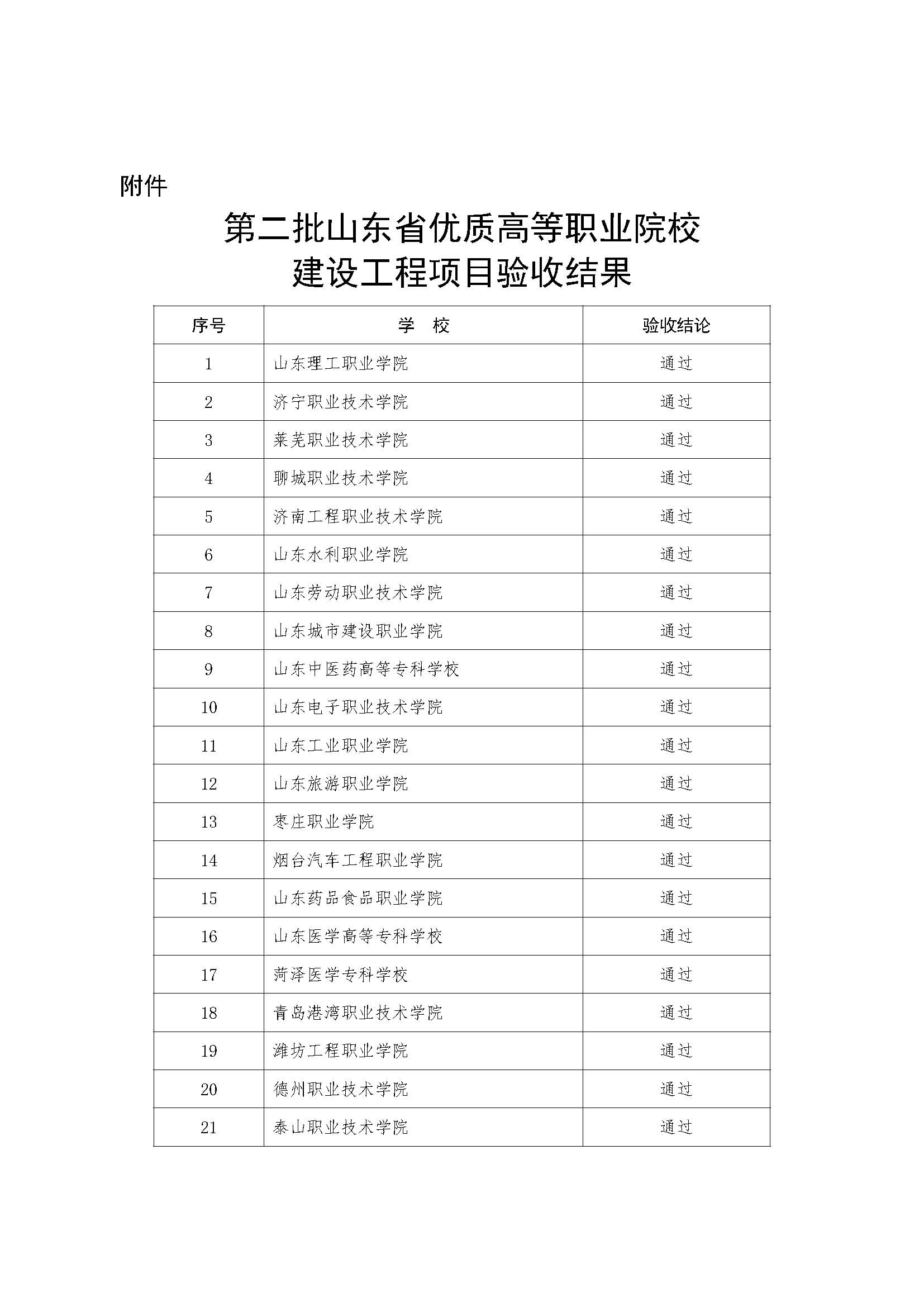 根據(jù)山東省優(yōu)質(zhì)高等職業(yè)院校建設(shè)工程實施管理規(guī)定,在學(xué)校自評、項目審計基礎(chǔ)上,我廳組織專家采取現(xiàn)場評估方式,對第二批立項建設(shè)的省優(yōu)質(zhì)高職院校進(jìn)行了驗收。按照《山東省教育廳 山東省財政廳關(guān)于實施山東省優(yōu)質(zhì)高等職業(yè)院校建設(shè)工程的通知》(魯教職字〔2017〕4號)相關(guān)規(guī)定,依據(jù)專家驗收結(jié)果,21所立項建設(shè)的第二批省優(yōu)質(zhì)高職院校全部驗收通過,授予“山東省優(yōu)質(zhì)高等職業(yè)院?!狈Q號。驗收結(jié)果經(jīng)公示無異議,現(xiàn)予以公布(見附件)。