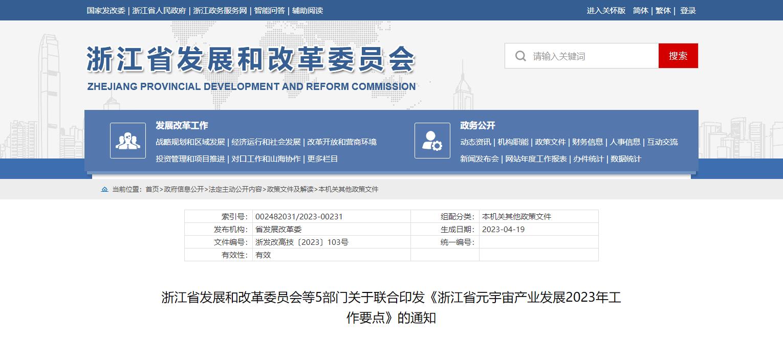 浙江省發(fā)改委等5部門近日聯(lián)合印發(fā)《浙江省元宇宙產(chǎn)業(yè)發(fā)展2023年工作要點(diǎn)》