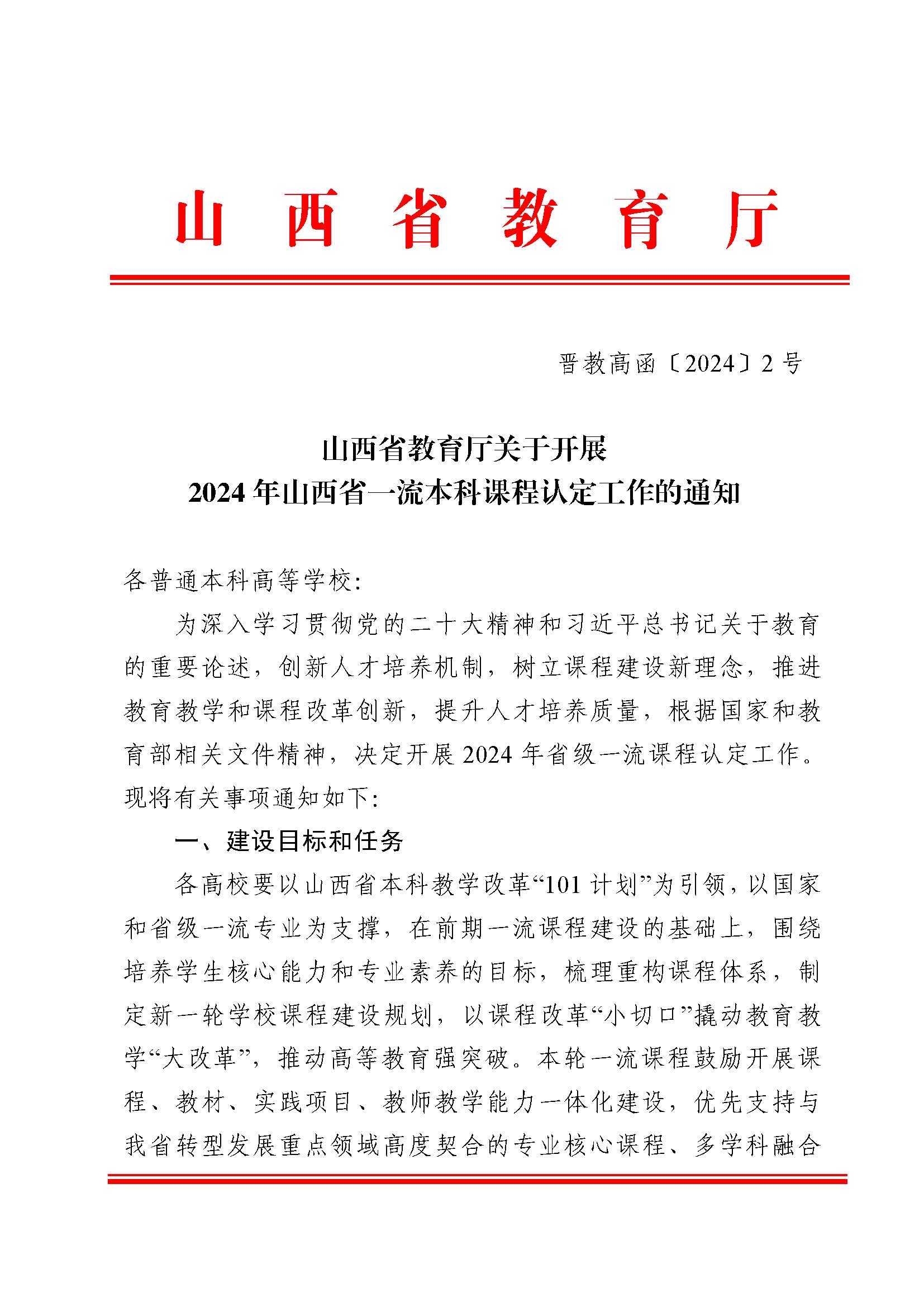 山西省教育廳發(fā)布關(guān)于開展 2024 年山西省一流本科課程認定工作的通知